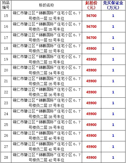 5、銅仁市碧江區(qū)“錦鵬國際”住宅小區(qū)6、7號樓負(fù)一層;32號、35號、53號,負(fù)二層;32號-47號共計19個車位,起拍價:45900元-56700元,競買保證金:1萬元/個。