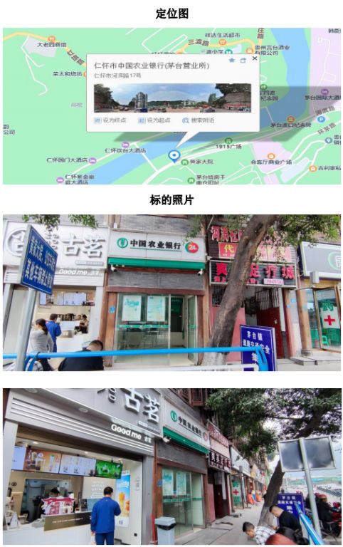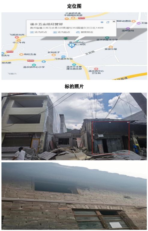 1、標的坐落于仁懷市茅臺鎮河濱社區,房屋地上共7層,標的所在層數位于第1層,建筑面積:34.65㎡,建筑結構:混合結構,設計用途為商業,分攤土地使用權面積:4.98㎡,地類(用途):辦公用地,使用權類型:國家作價出資入股。