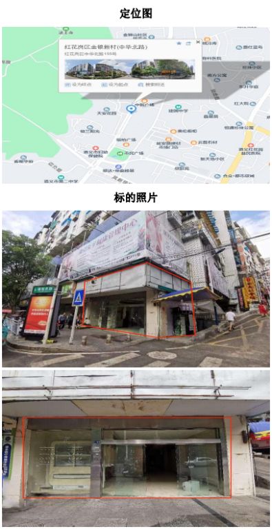 1、標的坐落于遵義市南白鎮(現南白街道)白錦小區二期三段,房屋地上共9層,標的所在層數位于第1層,建筑面積:57.31㎡,建筑結構:混合結構,規劃用途為營業,分攤土地使用權面積:6.28㎡,地類(用途):商業(金融),使用權類型:出讓。