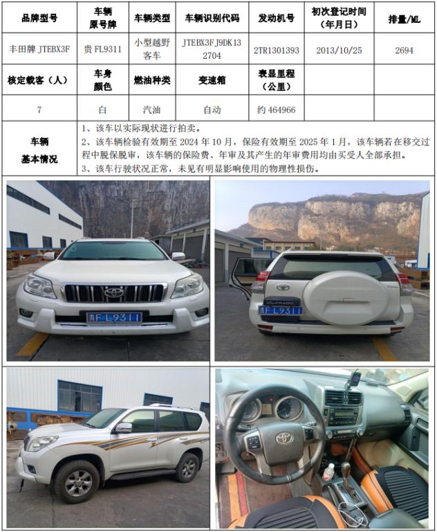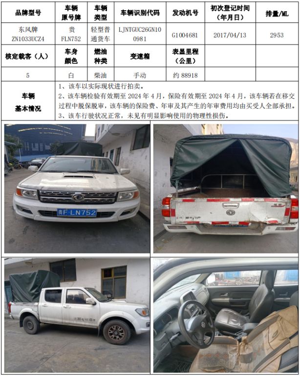 拍品編號1:豐田牌JTEBX3F小型越野客車、東風牌ZN1033UCZ4輕型普通貨車,共計2輛,整體拍賣