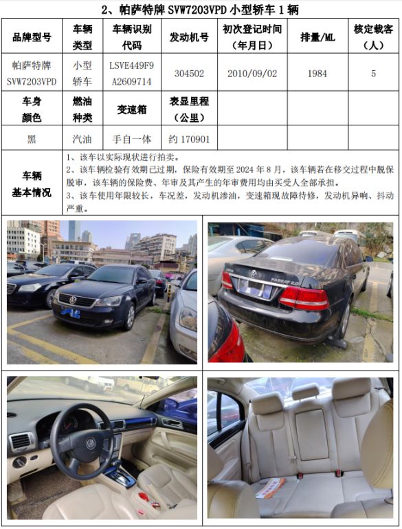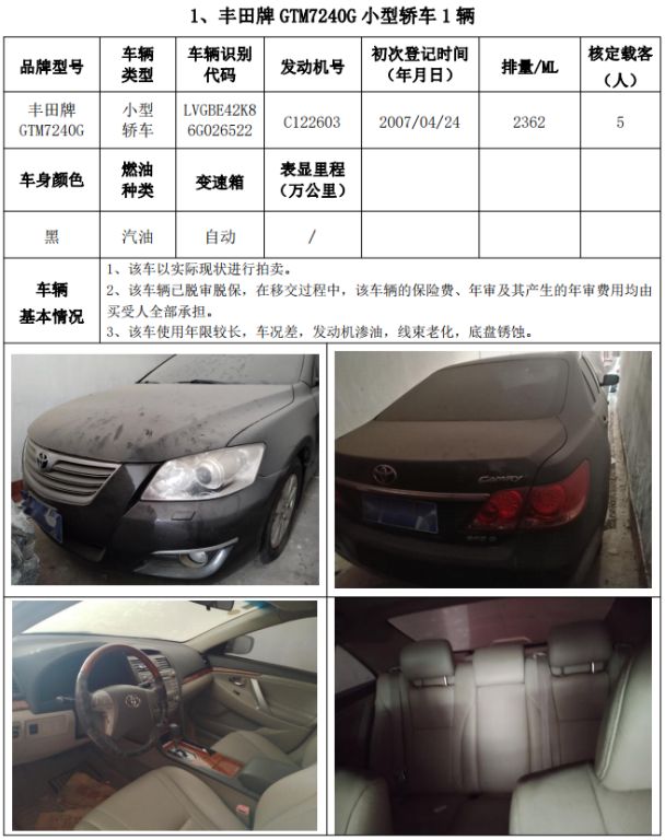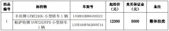 拍品編號1:豐田牌GTM7240G小型轎車1輛、帕薩特牌SVW7203VPD小型轎車1輛,共計2輛,整體拍賣