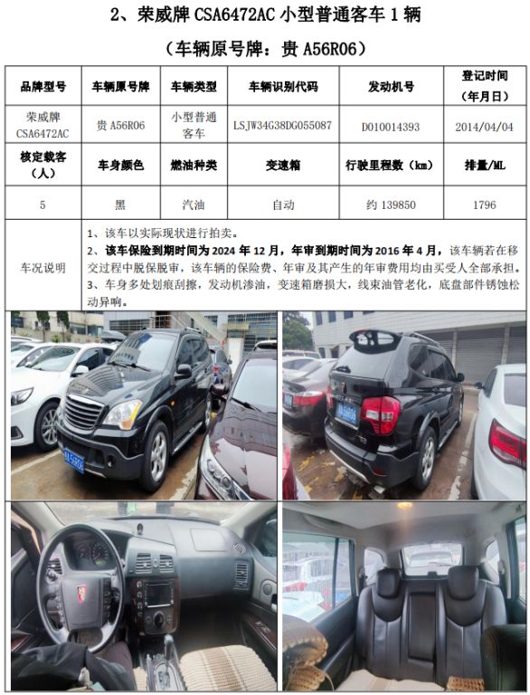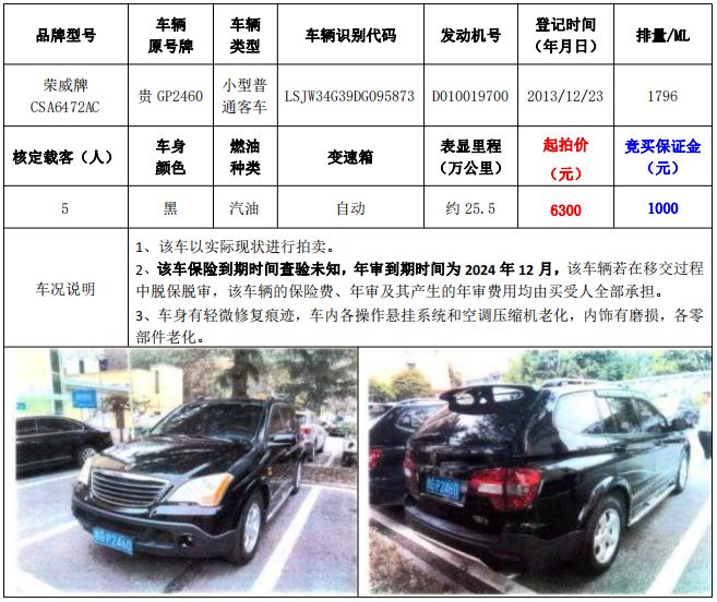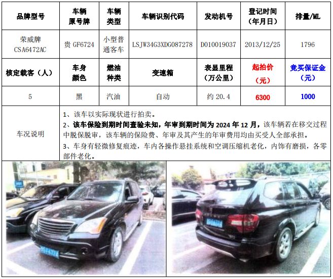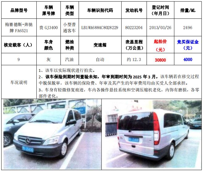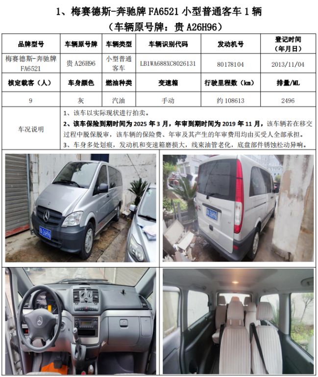 拍品編號(hào)1:梅賽德斯-奔馳牌FA6521小型普通客車1輛、榮威牌CSA6472AC小型普通客車1輛,共計(jì)2輛(整體拍賣)