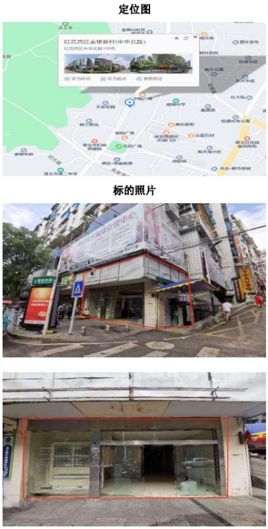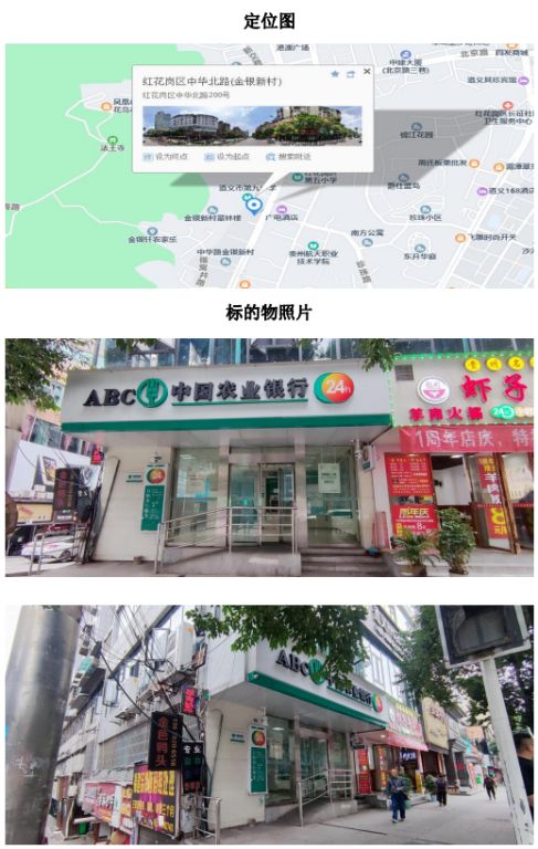 1、該標的位于貴州省遵義市紅花崗區中華南路群力大廈1層,東臨中華南路,其余三面臨其他物業地塊,周邊商業氛圍濃重,交通便利,水、電設施齊全。標的按照銀行營業點進行過簡單裝修。
