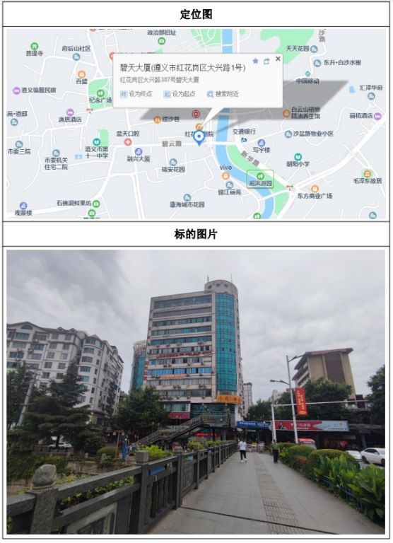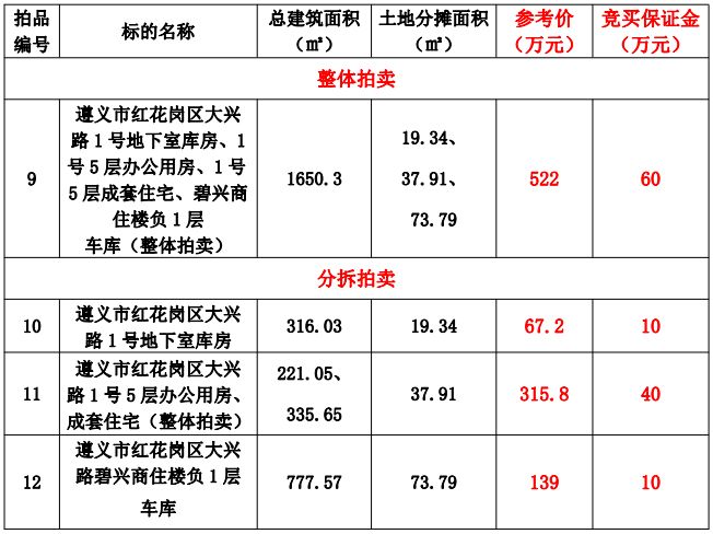 標的:遵義市紅花崗區大興路1號地下室庫房、1號5層辦公用房、1號5層成套住宅、碧興商住樓負1層車庫
