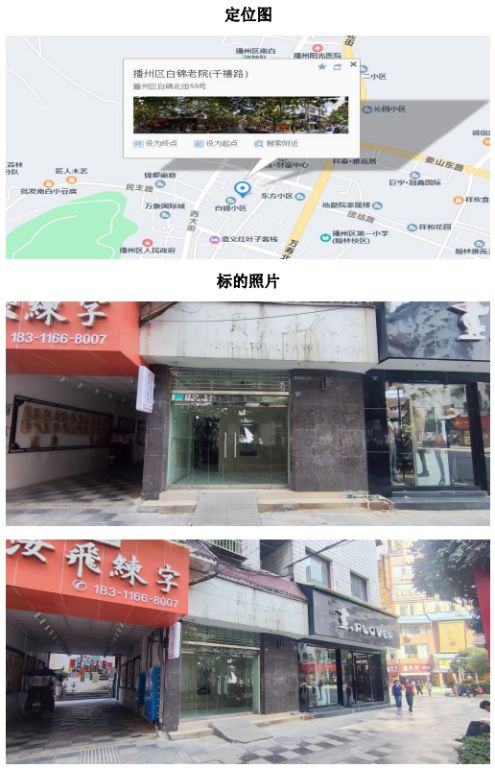 1、標的坐落于遵義市南白鎮(現南白街道)白錦小區二期三段,房屋地上共9層,標的所在層數位于第1層,建筑面積:57.31㎡,建筑結構:混合結構,規劃用途為營業,分攤土地使用權面積:6.28㎡,地類(用途):商業(金融),使用權類型:出讓。