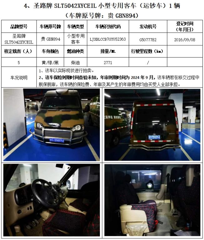 拍品編號1:圣路牌SLT5040XYCE1W輕型封閉式貨車(運鈔車)3輛、圣路牌SLT5042XYCEIL小型專用客車(運鈔車)1輛,共4輛,整體拍賣