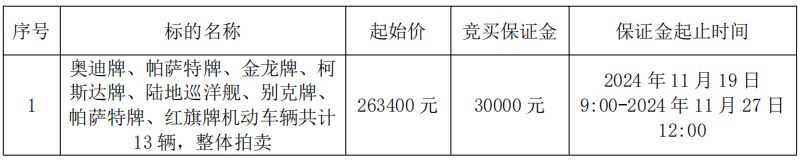 拍品編號1:奧迪牌、帕薩特牌、金龍牌、柯斯達牌、陸地巡洋艦、別克牌、帕薩特牌、紅旗牌機動車輛共計13輛,整體拍賣