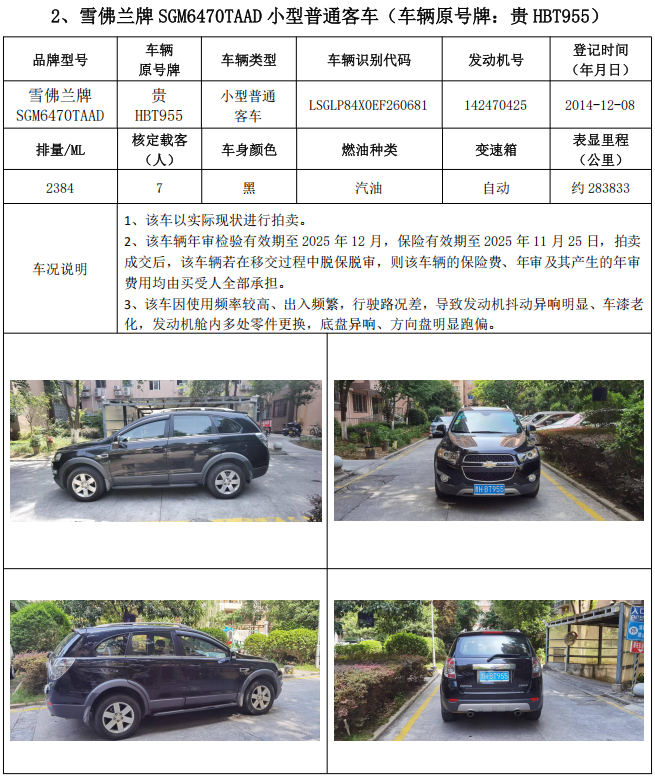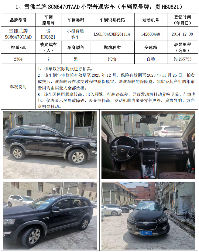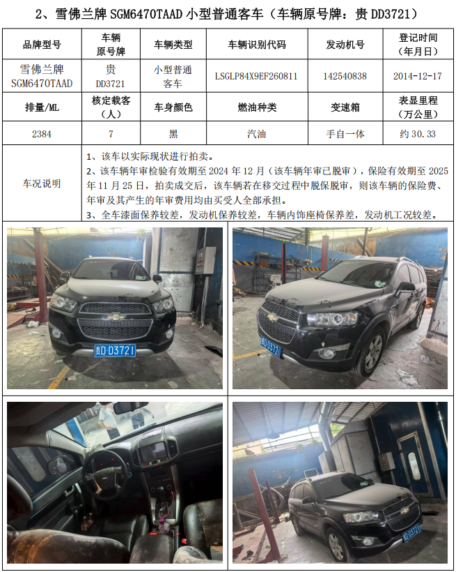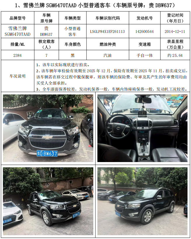 1、雪佛蘭牌SGM6470TAAD小型普通客車2輛,整體拍賣,起拍價:14100元,競買保證金:5000元;