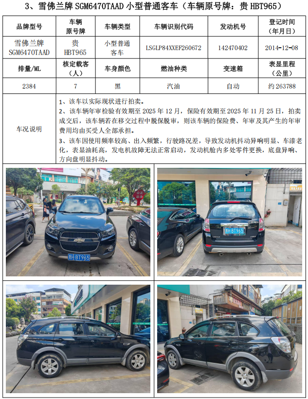 2、雪佛蘭牌SGM6470TAAD小型普通客車3輛,整體拍賣,起拍價:22221元,競買保證金:5000元。