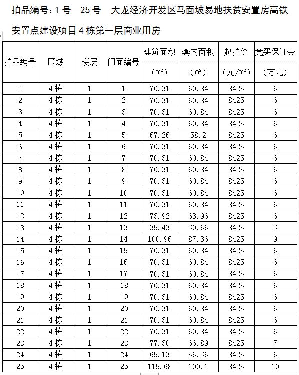 1、大龍經濟開發區馬面坡易地扶貧安置房高鐵安置點建設項目4棟第一層商業用房25間,建筑面積為35.43㎡-115.68㎡,起拍價:8425元/㎡,競買保證金3—10萬元/間;