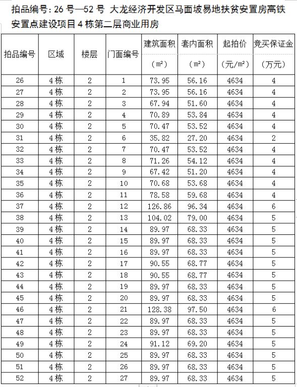 2、大龍經濟開發區馬面坡易地扶貧安置房高鐵安置點建設項目4棟第二層商業用房27間,建筑面積為35.82㎡-128.38㎡,起拍價:4634元/㎡,競買保證金2—6萬元/間;
