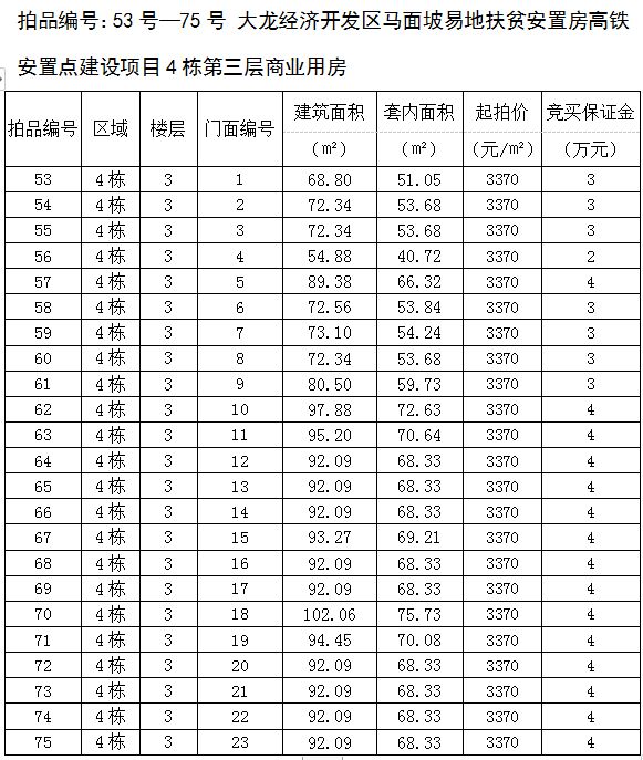 3、大龍經濟開發區馬面坡易地扶貧安置房高鐵安置點建設項目4棟第三層商業用房23間,建筑面積為54.88㎡-102.06㎡,起拍價:3370元/㎡,競買保證金2—4萬元/間;