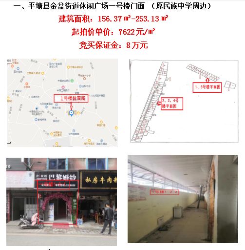 標的位于平塘縣金盆街道休閑廣場,相當于縣中心,人流量大,交通便利,停車場數量多,商業繁華程度較好;一號樓建成于1995年,總層數7層,1-2層為商業;建筑面積:156.37㎡-253.13㎡,建筑結構為磚混,外墻為貼磚,土地性質:國有劃撥,土地用途:商業用地;區域內公共配套設施有平塘民族中學、平塘中等職業學校、貴品廣場等。