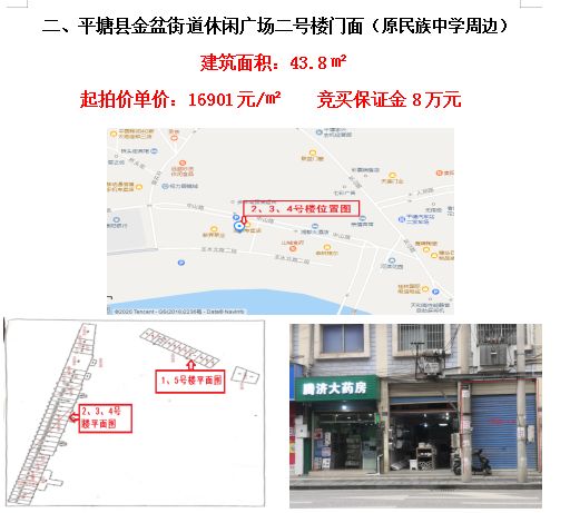 標的位于平塘縣金盆街道休閑廣場,相當于縣中心,人流量大,交通便利,停車場數量多,商業繁華程度較好;二號樓建成于2005年,總層數6層,1層為商業;建筑面積:43.8㎡,建筑結構為磚混,外墻為貼磚,土地性質:國有劃撥,土地用途:商業用地;區域內公共配套設施有平塘民族中學、平塘中等職民族中學、平塘中等職業學校、貴品廣場等。