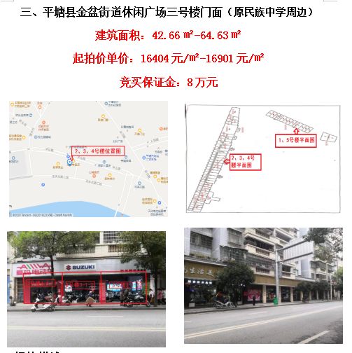 標的位于平塘縣金盆街道休閑廣場,相當于縣中心,人流量大,交通便利,停車場數量多,商業繁華程度較好;三號樓建成于2004年,總層數7層,1層為商業;建筑面積:42.66㎡-64.63㎡,建筑結構為磚混,外墻為貼磚,土地性質:國有劃撥,土地用途:商業用地;區域內公共配套設施有平塘民族中學、平塘中等職業學校、貴品廣場等。