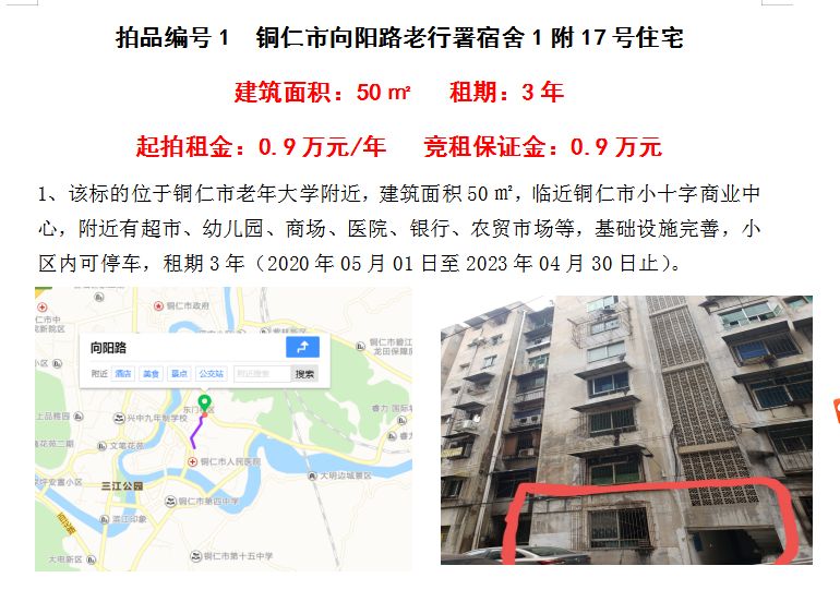 1、銅仁市向陽(yáng)路老行署宿舍1附17號(hào)住宅3年租賃權(quán)(建筑面積:50㎡);起拍租金單價(jià):0.90萬元/年;競(jìng)租保證金:0.90萬元;