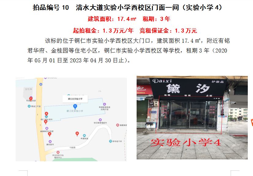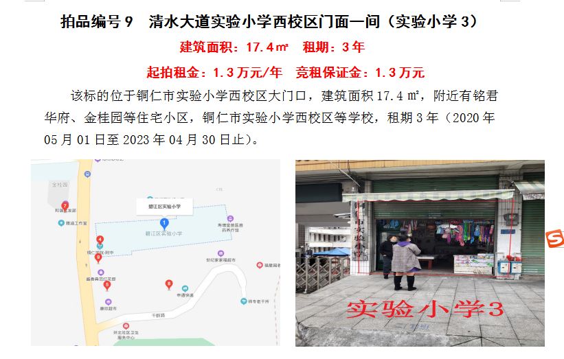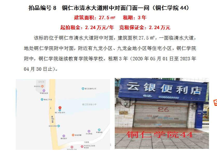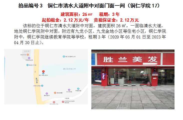 3、銅仁市清水大道附中對(duì)面門面一間3年租賃權(quán)(建筑面積:26㎡);起拍租金單價(jià):2.12萬元/年;競(jìng)租保證金:2.12萬元;