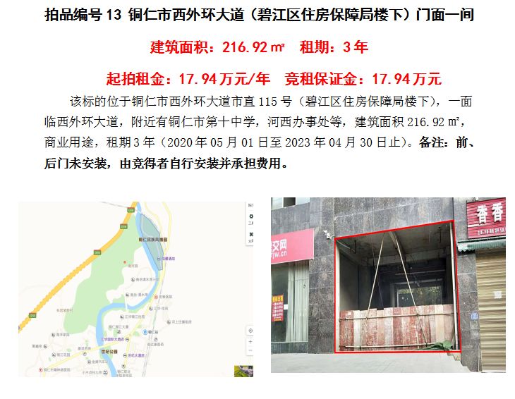 7、銅仁市西外環(huán)大道(碧江區(qū)住房保障局樓下)門面一間3年租賃權(quán)(建筑面積:216.92㎡);起拍租金單價(jià):17.94萬元/年;競(jìng)租保證金:17.94萬元;