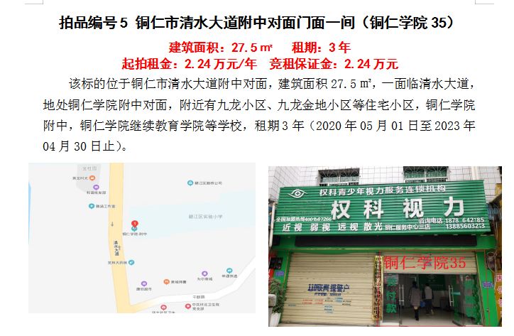 4、銅仁市清水大道附中對(duì)面門面五間3年租賃權(quán)(建筑面積:27.5㎡/間);起拍租金單價(jià)(每間):2.24萬元/年;競(jìng)租保證金(每間):2.24萬元;