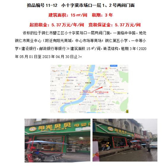 6、小十字菜市場(chǎng)口一層1-2號(hào)兩間門面3年租賃權(quán)(建筑面積15㎡/間);起拍租金單價(jià)(每間):5.37萬元/年;競(jìng)租保證金(每間):5.37萬元;