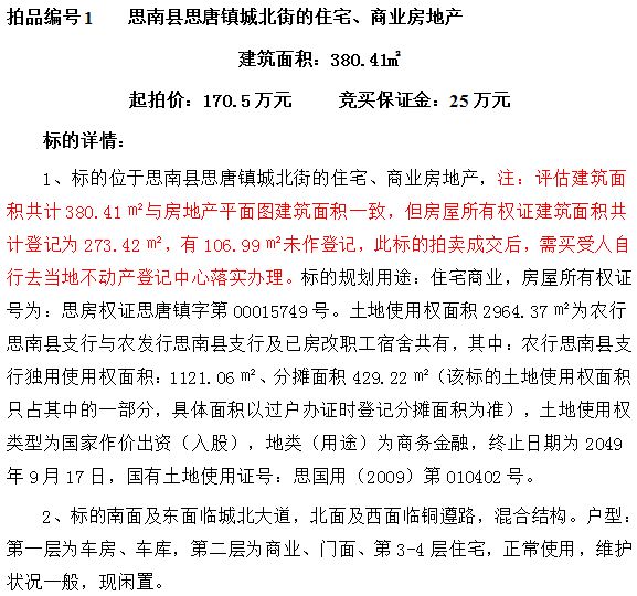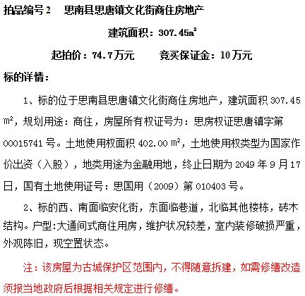 2、思南縣思唐鎮(zhèn)文化街商住房地產(chǎn),建筑面積共:307.45㎡;起拍價:74.7萬元;競買保證金:10萬元