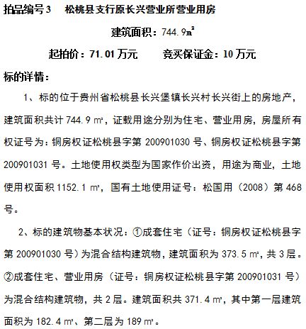 3、松桃縣支行原長興營業(yè)所營業(yè)用房,建筑面積共:744.9㎡;起拍價:71.01萬元;競買保證金:10萬元